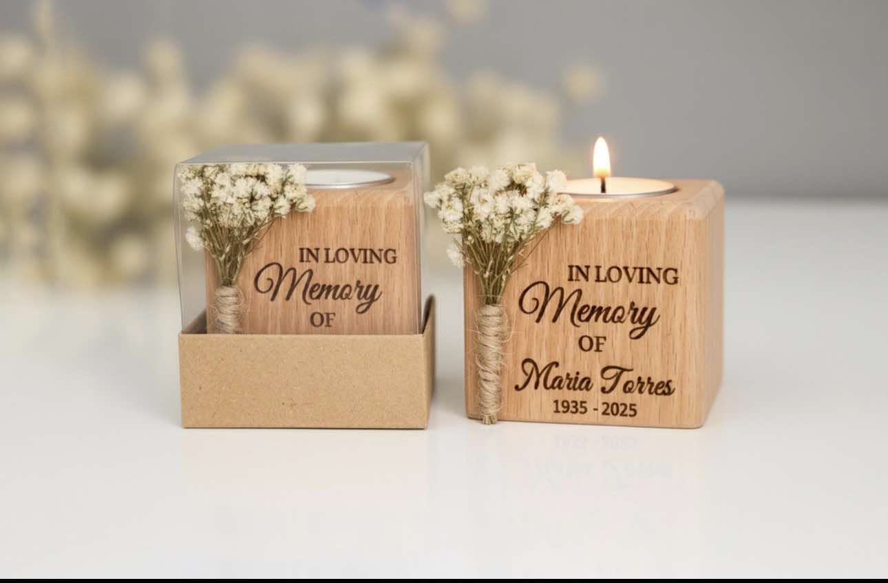 Honor the memory of a loved one with our Personalized Memorial Tealight Candle Holder, a timeless keepsake designed to bring warmth and comfort to any remembrance space. Each candle holder is beautifully crafted from natural wood and engraved with your loved one’s name, years of life, and the heartfelt phrase “In Loving Memory Of.”