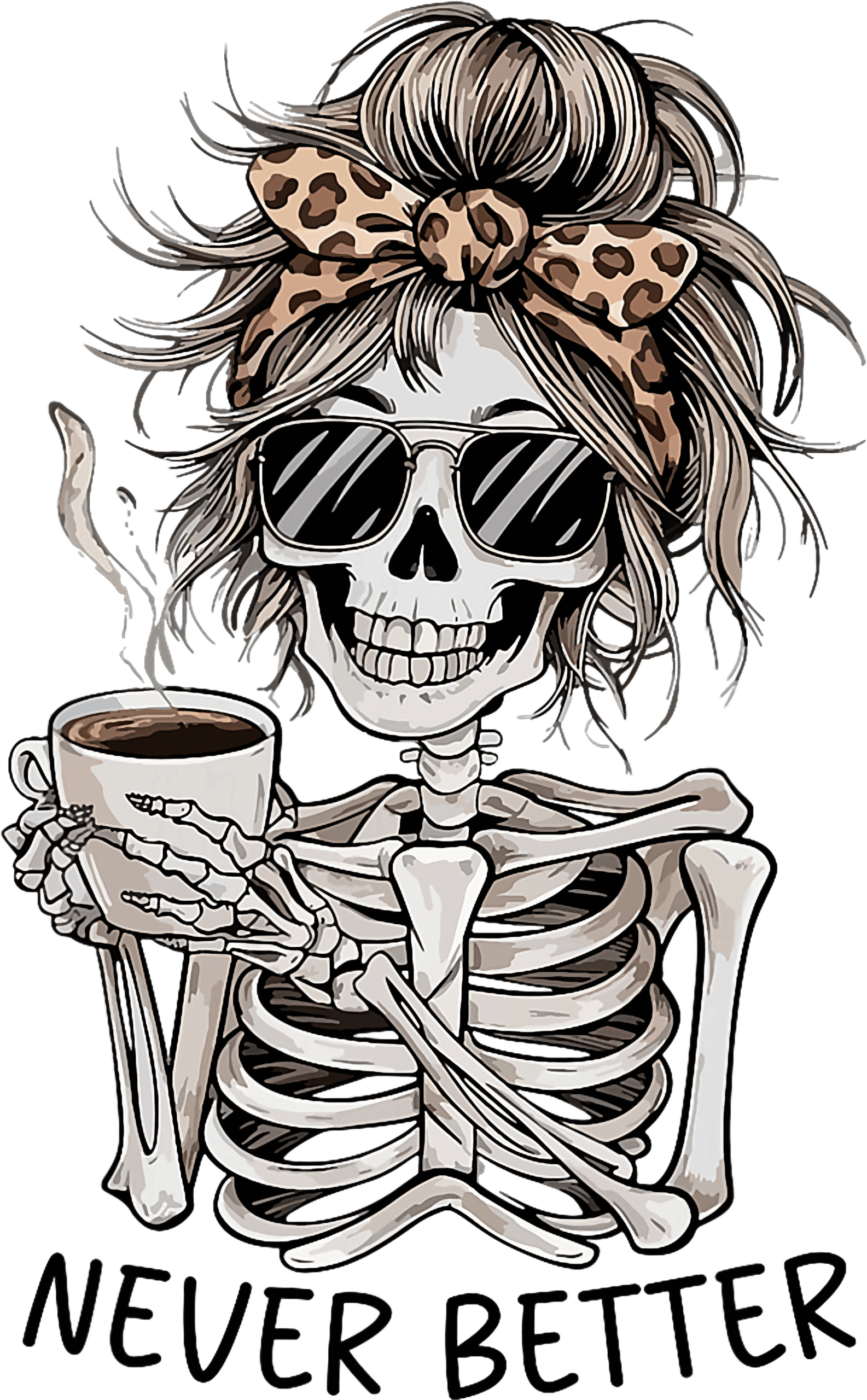 Relatable Humor: Keep it real with the “Mama, Mommy, Mom, Bruh.” text stack for moms of teenagers, or the hilarious “Never Better” Skeleton drinking coffee—perfect for those exhausted days.